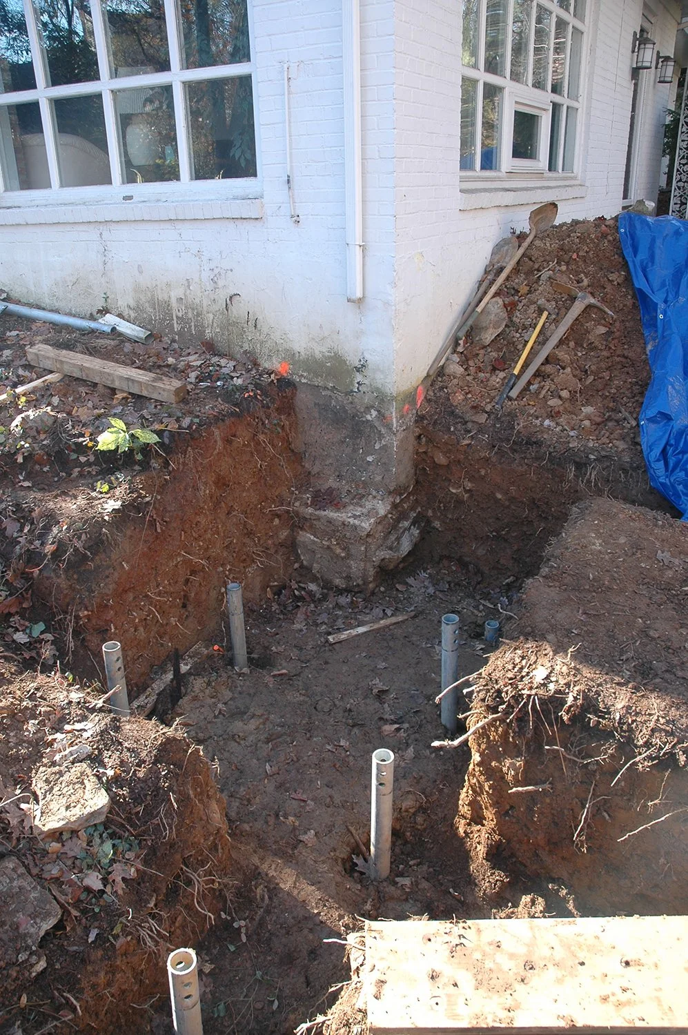 In the foreground are five of installed the helical piers and just beyond is the original house’s front door.